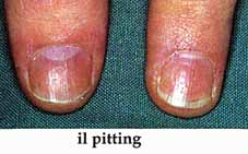 Il pitting è l’alterazione più comune e si presenta con depressioni a “ditale da cucito”.